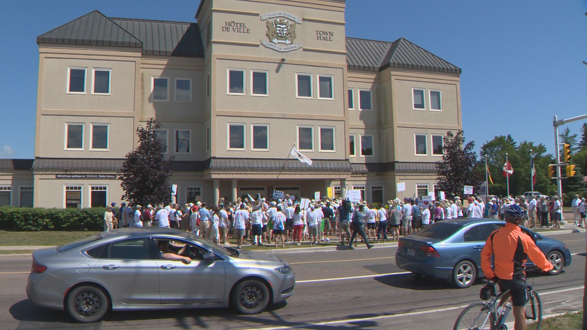 About 250 people marched onto Shediac City Hall on Sunday, to denounce the government’s handling of water quality issues at beaches in and around Shediac Bay.