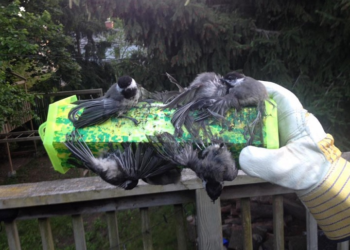 Phoenix Pike posted on Facebook this week what appears to be black-capped chickadees stuck to a “TrapStik” wasp trap.
