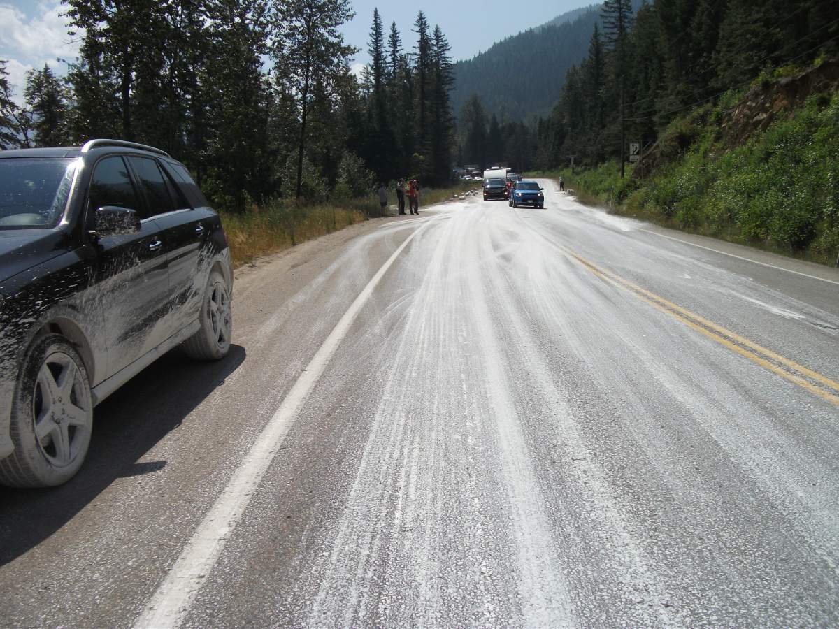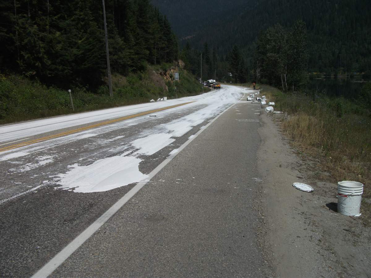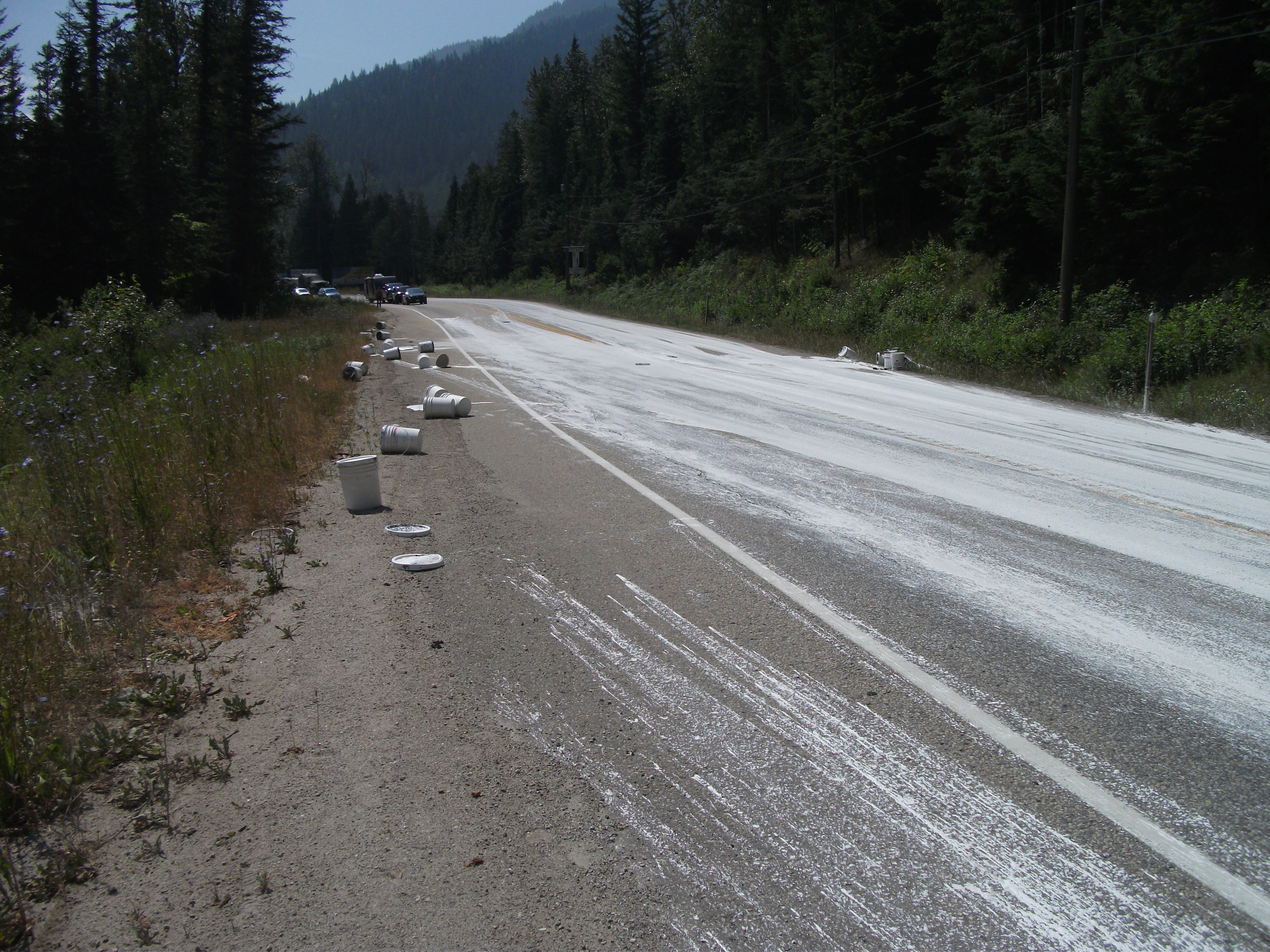 The Trans-Canada Highway was closed for about 90 minutes Wednesday afternoon west of Revelstoke when a semi hauling paint lost around 60 industrial sized buckets on the roadway.