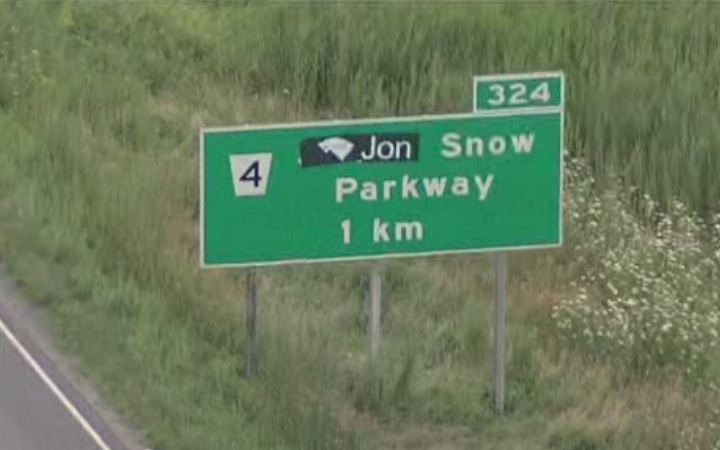 Jon Snow, a fictional character on the popular HBO television series Game of Thrones, now has a Toronto-area highway sign named after him, at least temporarily.