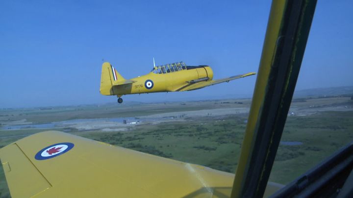Each flies a Harvard – a plane used extensively as an advanced trainer for Second World War.