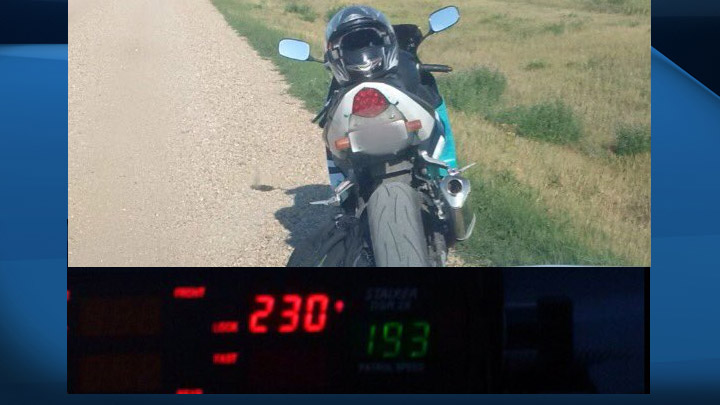A combined traffic services Saskatchewan (CTSS) officer clocked the motorcycle driver doing 230 km/h on Highway 41.