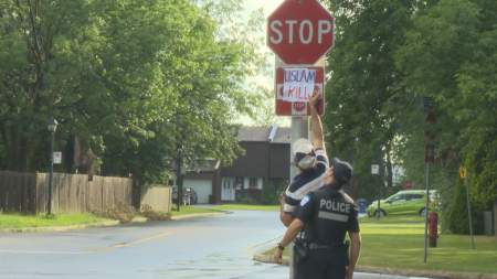 Montreal Police are investigating after a stop sign was defaced in Dollard-des-Ormeaux, near the corner of De Salaberry and Davignon.