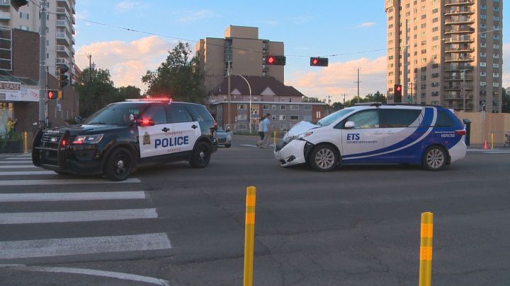 Edmonton police said officers arrested a man Wednesday night in connection with a stolen Edmonton Transit Service van that crashed on Jasper Avenue at 114 Street.