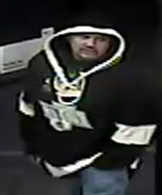 He is described as Caucasian, 30 to 35 years old, about 5’10” and 210 pounds, with a sparse black mustache and short beard. He was wearing a black Los Angeles Kings hoodie with “Gretzky 99” on the back, tan work boots and blue jeans.