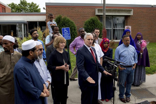 Governor Mark Dayton, along with a delegation of public officials, visited the mosque on Sunday morning. He called on the community to unite against such attacks.