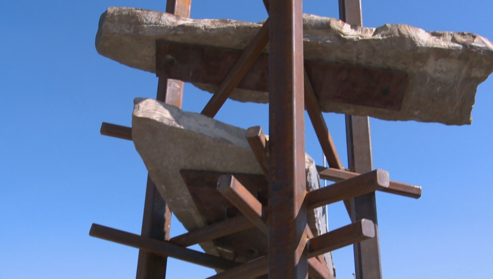 The sculpture uses Rundle Rock stones, which are found only in Alberta.
