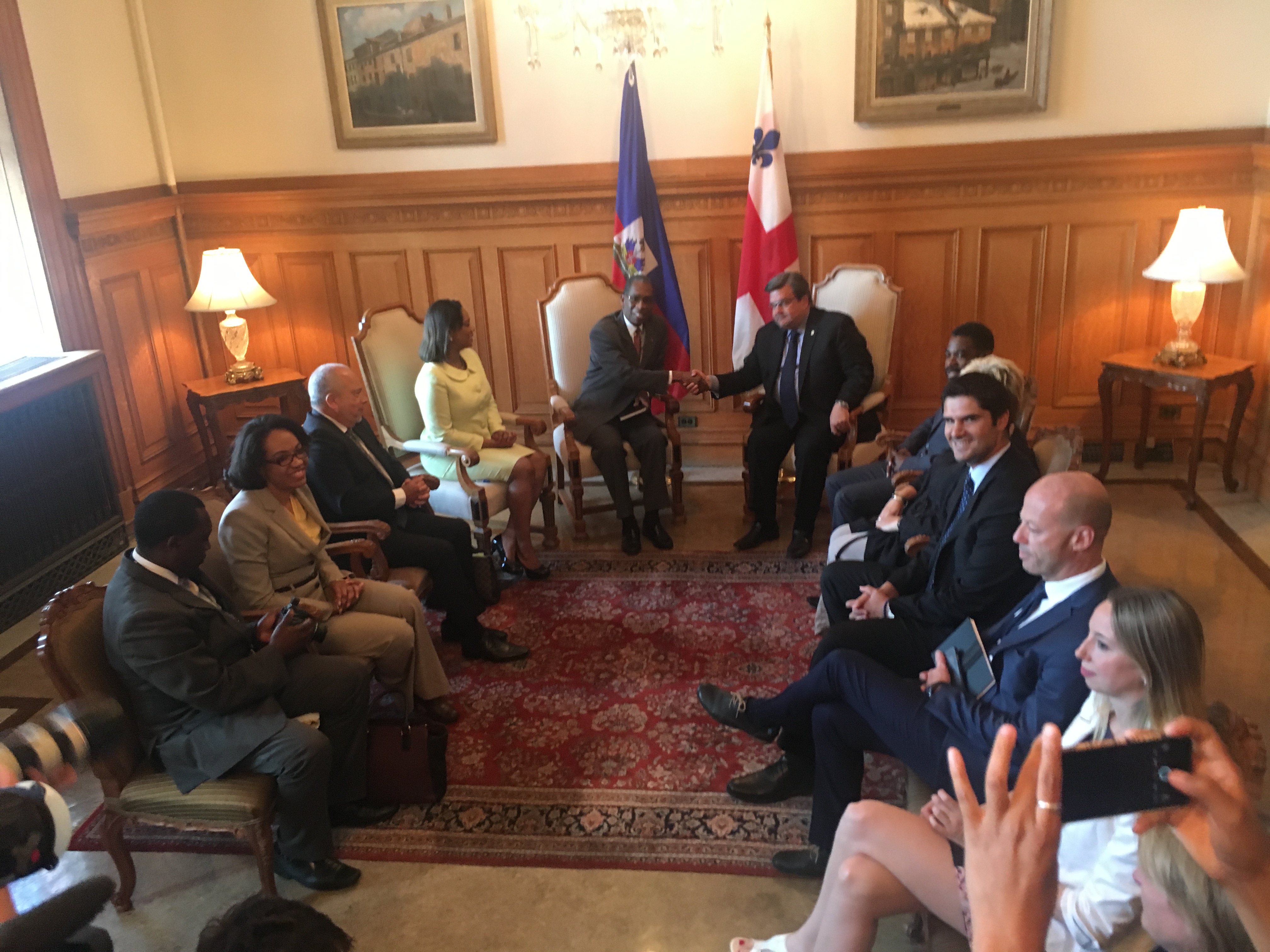 Antonio Rodrigue, Haiti’s foreign affairs minister, and Stephanie Auguste, minister for Haitians living abroad, first stopped at Montreal’s city hall to meet Mayor Denis Coderre on Tuesday.