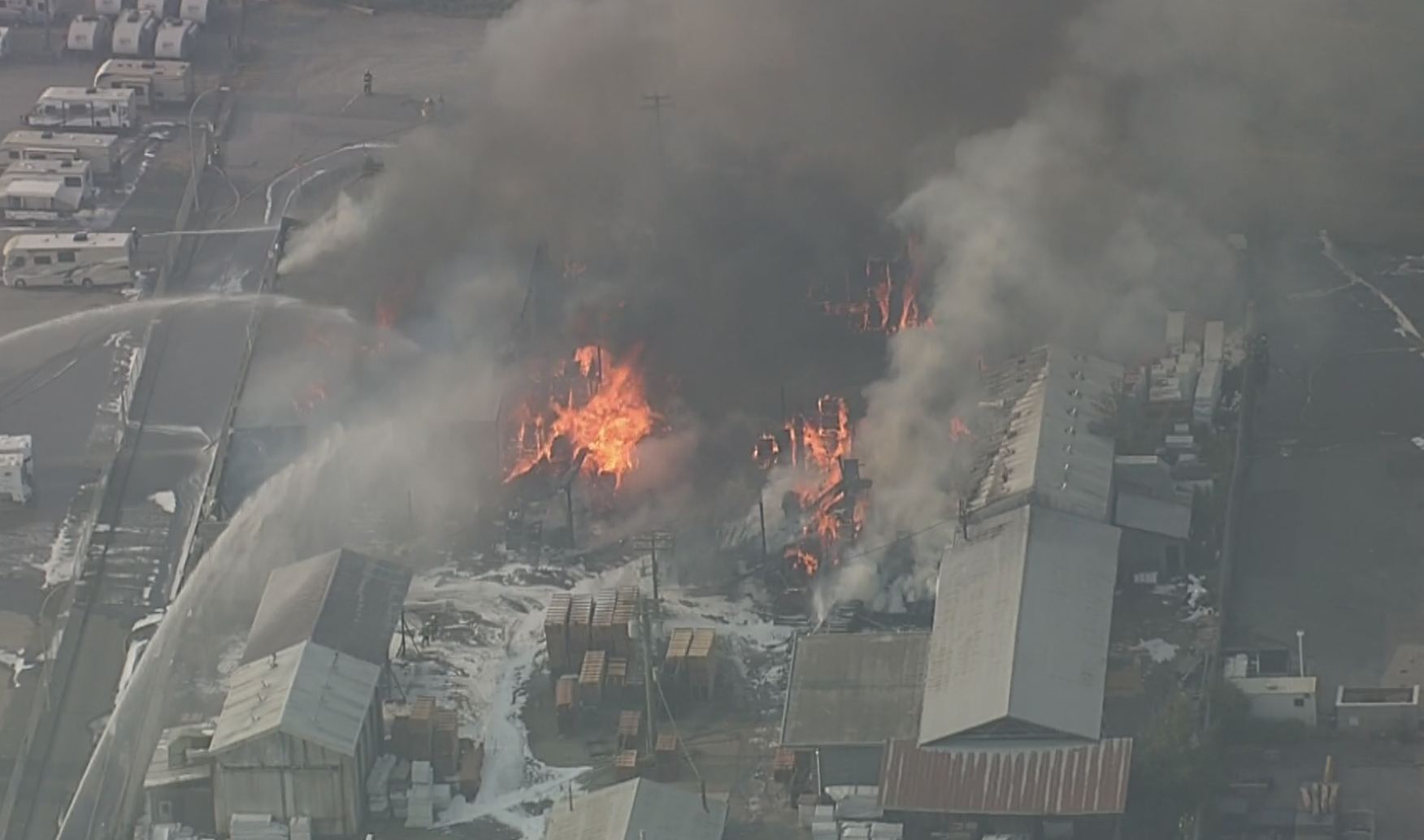 Aerial images appeared to show the fire burning multiple structures at Precision Custom Lumber, on the 30500 block of Matsqui Place.