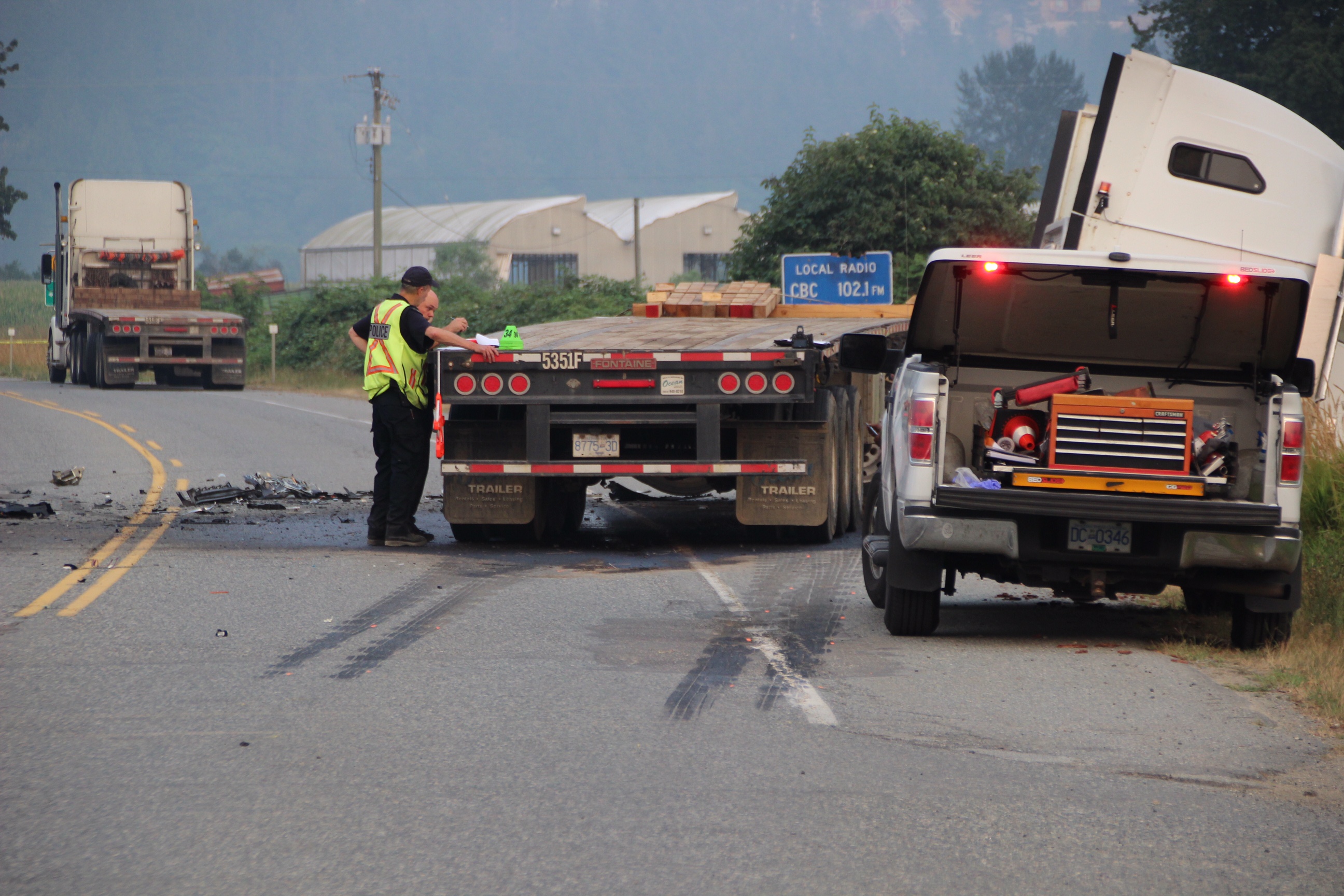 Shortly after 3 p.m. Wednesday, a car crashed into two semi trucks at Lougheed Highway and Kennedy Road.