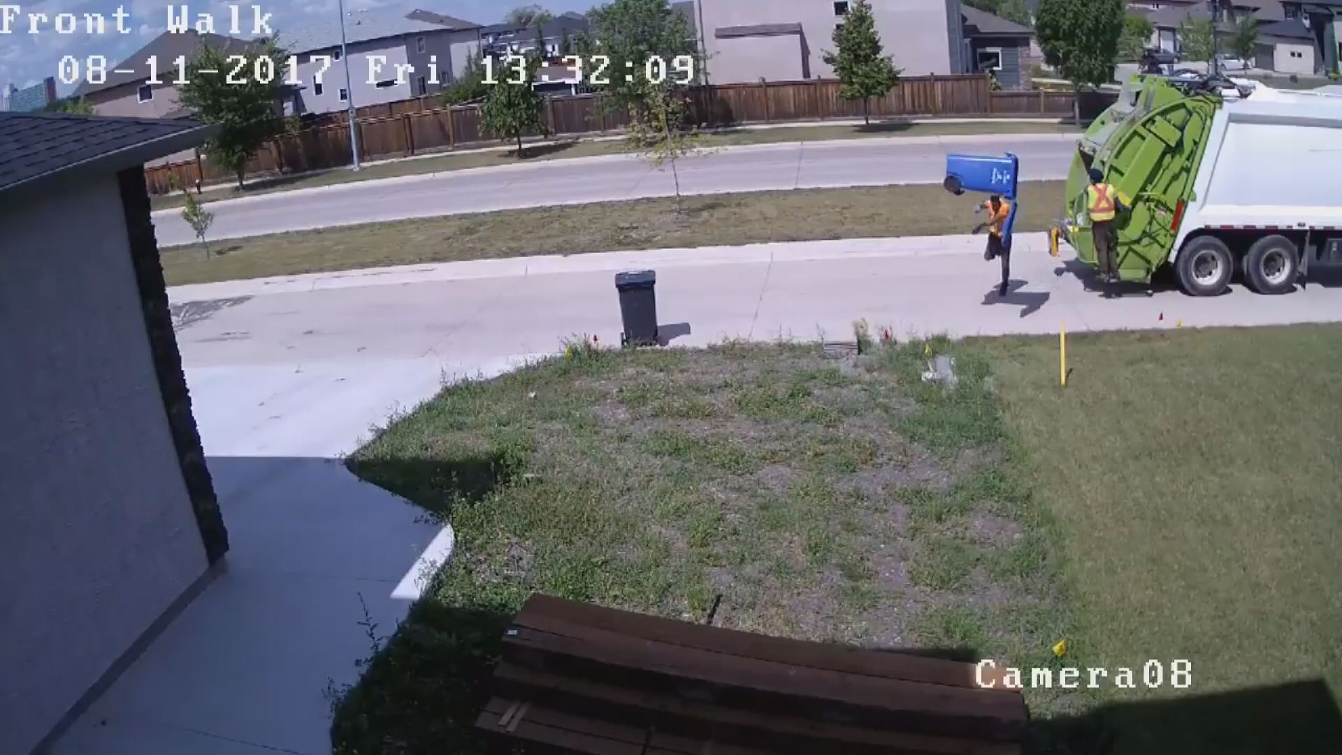 After the Emterra collection crew dumped the blue bin, a worker can be seen in the footage throwing the container on the front lawn. The bin ends up bouncing around a few times before landing.