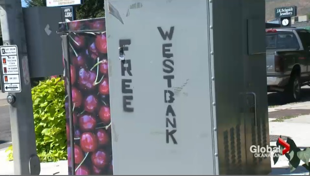 Someone is spray-painting the words “Free Westbank.” on utility boxes, highway overpasses, and even road signs in West Kelowna.