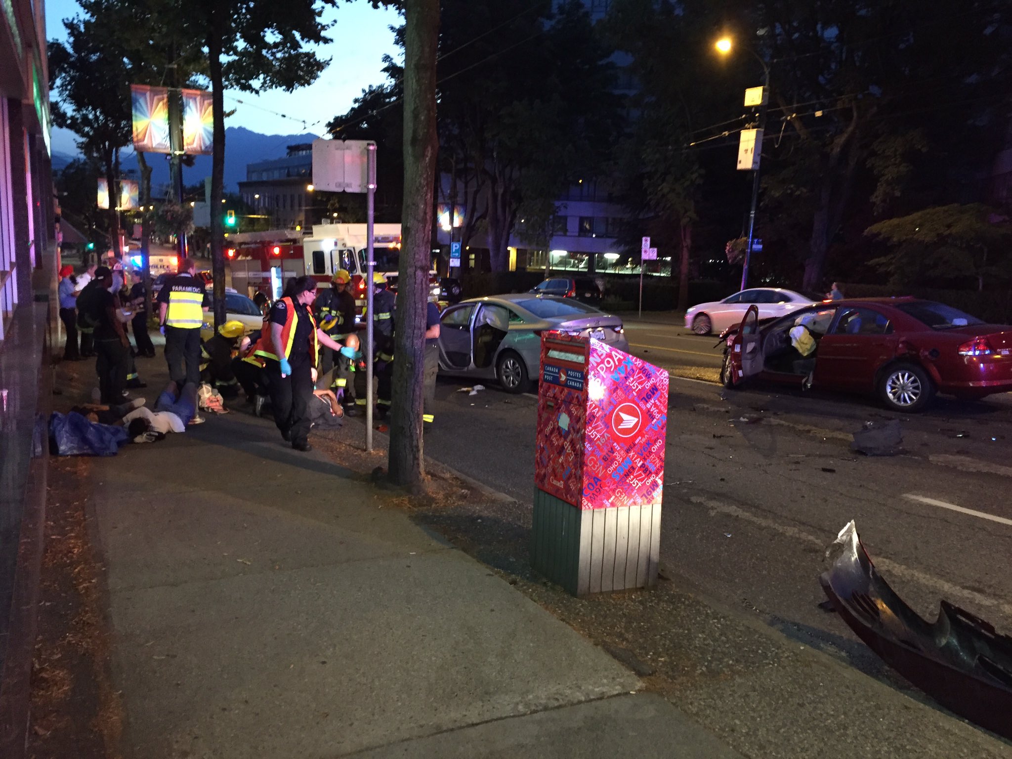 A multi-vehicle crash on Granville Street and West 16th Avenue in Vancouver Thursday morning has left at least four people hurt and delayed an Air Canada flight to Toronto.