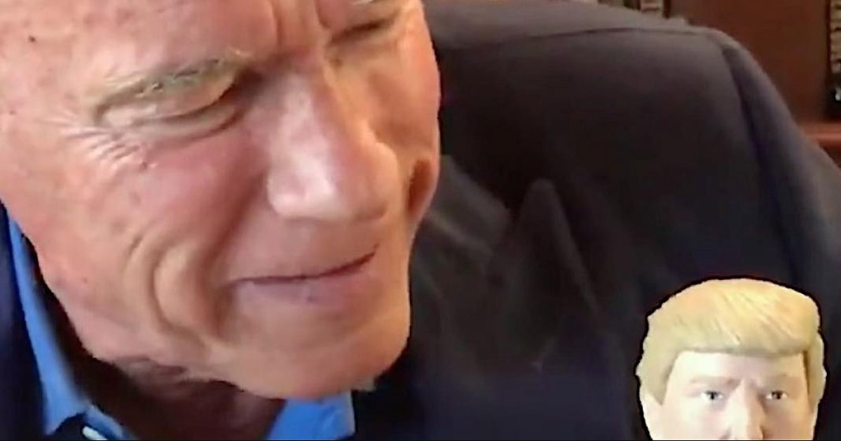 At the end of his message to Trump, Schwarzenegger gestures and speaks sarcastically to a Trump bobblehead on his desk.