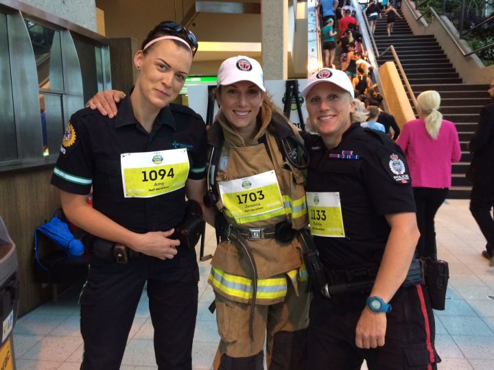 Police officer Sylvie Boy, firefighter Jessica LaMer and paramedic Amy Benson ran the 21-kilometre race wearing their uniforms and gear, which for LaMer included an oxygen tank.