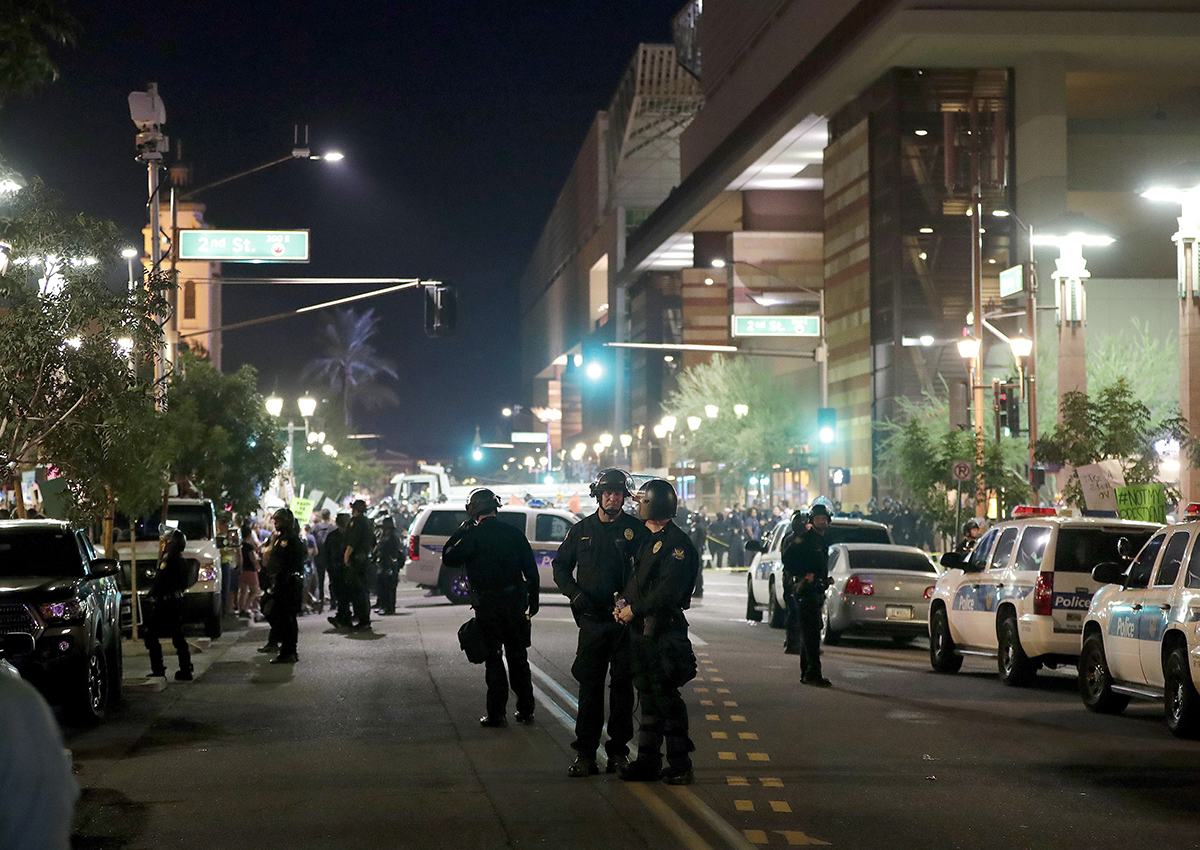 “People in the crowd have begun throwing rocks and bottles at police. They also dispersed some gas in the area,” Phoenix police spokesman Jonathan Howard said, adding that officers responded with pepper spray to “disperse the crowd.”