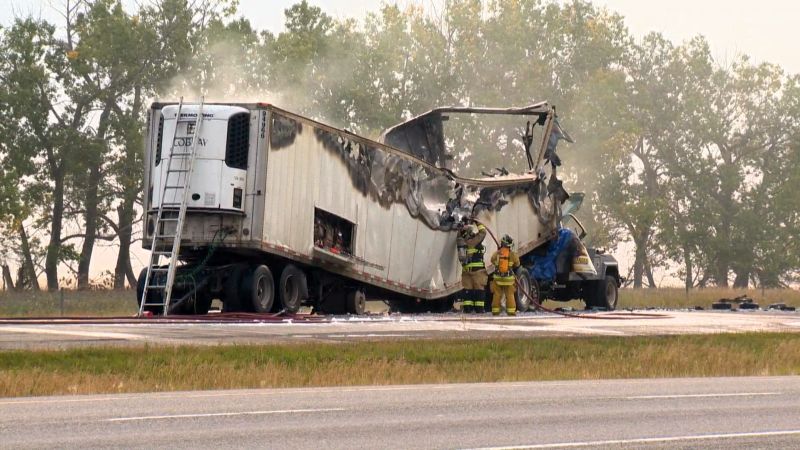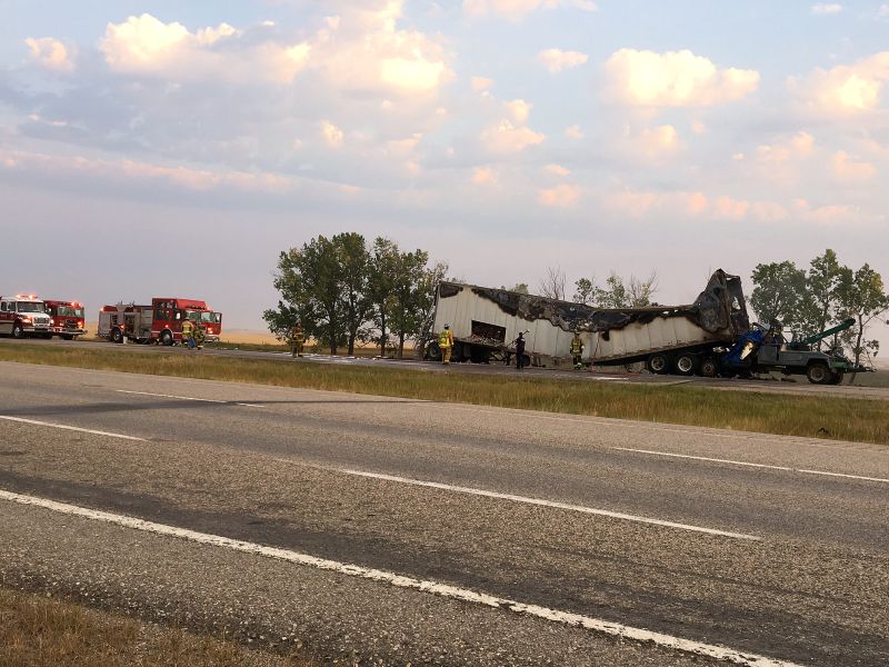 Cpl. Jay Salmon with the Strathmore RCMP said the driver of the semi-truck told investigators his vehicle was hit from behind by the tow truck.