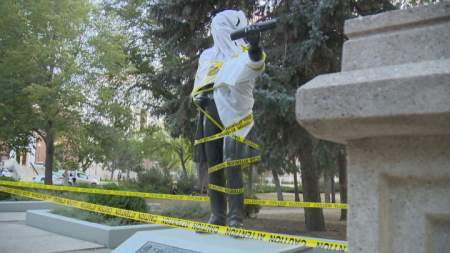 Protesters covered the statue of John A. Macdonald in Victoria Park this week with plastic wrap and caution tape.