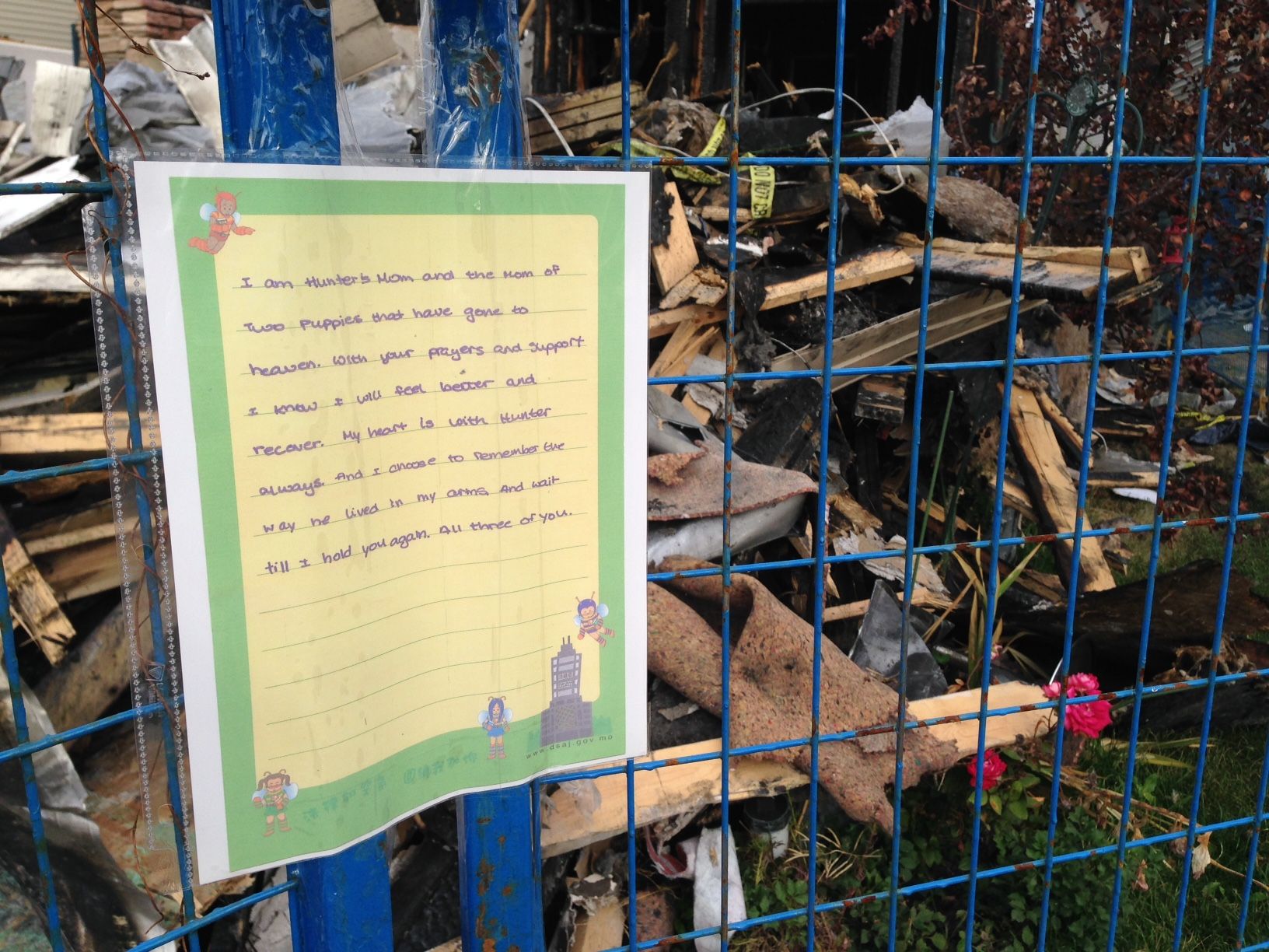 A letter from Angie Tang was posted on the fence that surrounds the burned down Ambleside home.