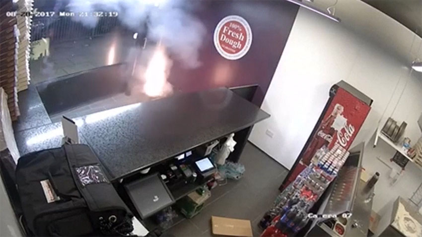 British police have been investigating closed-circuit video that shows a hooded man running into a Liverpool pizza parlour and leaving a box of 70 lit fireworks on the floor before running away and closing the door.