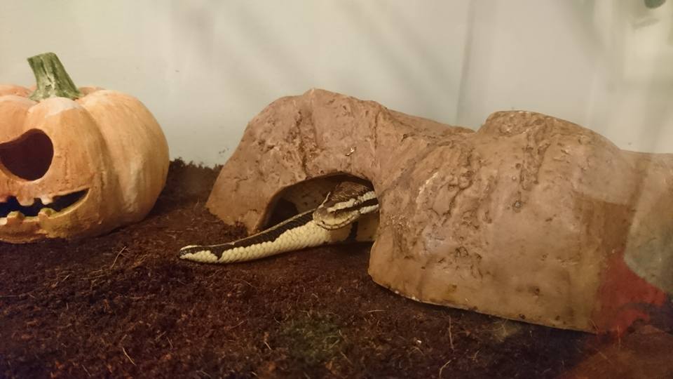 The two carefully moved the washing machine, so as not to injure the young ball python. Quebec-Stacey put on a pair of gloves and gently picked the snake up and placed it in a box.