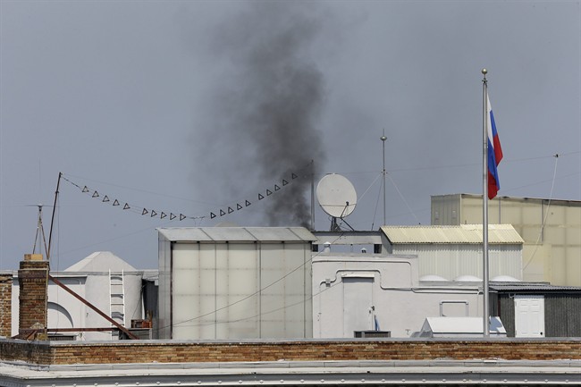 Acrid, black smoke was seen pouring from a chimney at the Russian consulate in San Francisco and workers began hauling boxes out of the stately building in a historic area of the city Friday, a day after the Trump administration ordered its closure amid escalating tensions between the United States and Russia.