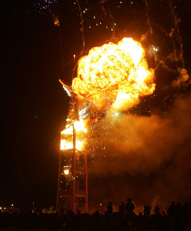 The nine-day event culminates with the burning of a towering 40-foot effigy made of wood. Attendees have tried to run into the flames as a symbol of rebirth.
