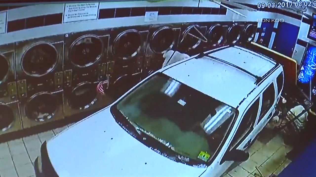Surveillance cameras at a Staten Island laundromat captured the moment when an elderly driver drove his car through the storefront, plowing through customers and equipment on Sunday.