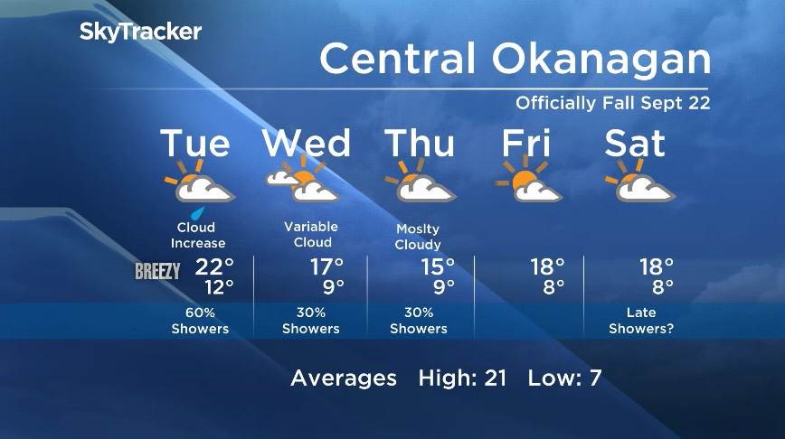 Eastern portions of the BC Interior such as the Columbia, Boundary, Arrow Lakes regions will see the highest chances of showers over the next few days.