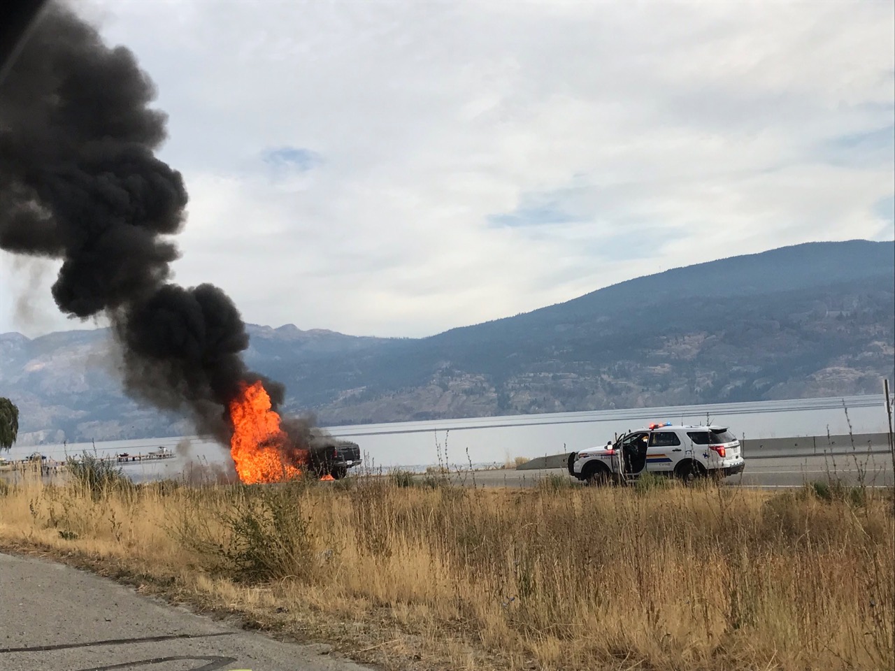 The pickup truck was engulfed in flames by the time emergency responders arrived.
