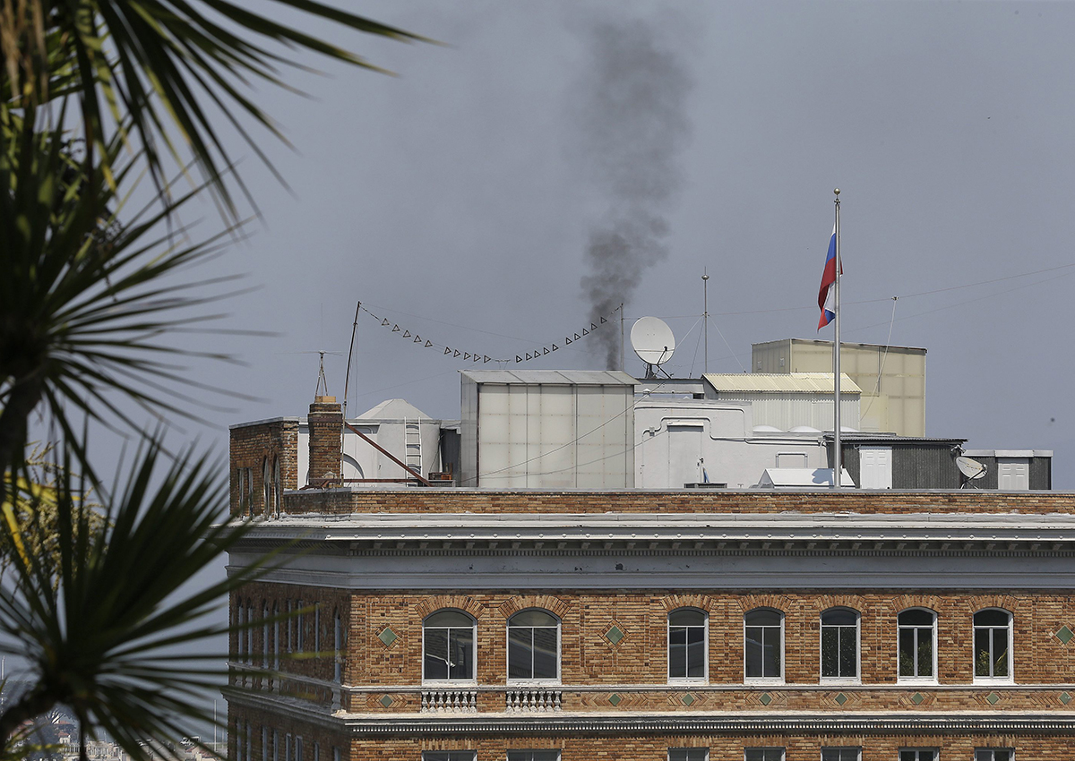 Smoke poured out of the consulate’s chimney on Sept. 1 as Russian diplomats packed to leave. The Russians refused assistance from firefighters.