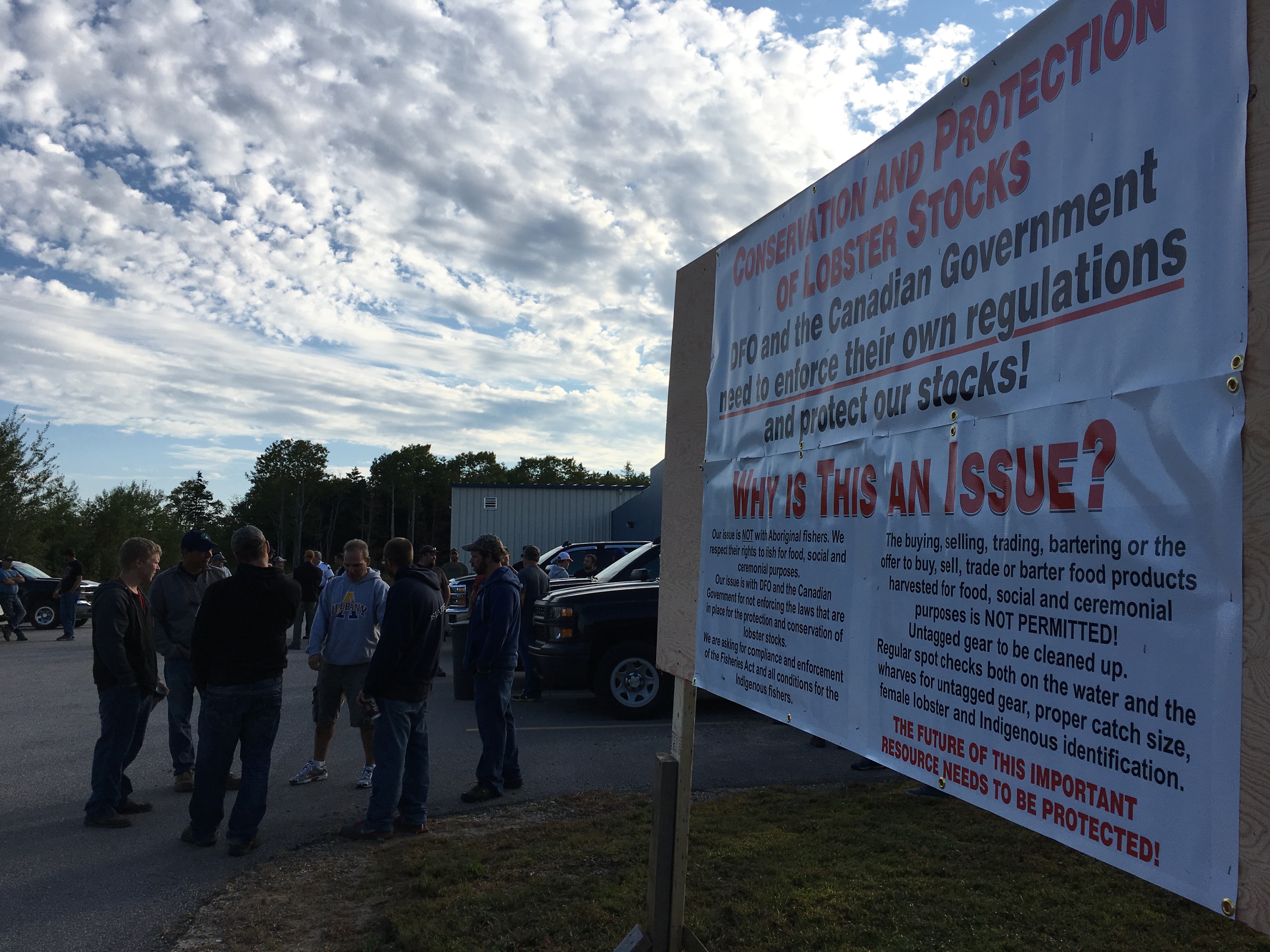 A large sign at the Digby protest read in part, “Our issue is not with Aboriginal fishers. We respect their right to fish for food, social and ceremonial purposes. Our issue is with the Canadian government for not enforcing the laws that are in place for the protection and conservation of lobster stocks. We are asking for compliance and enforcement of the Fisheries Act and all conditions for the Indigenous fishers.”