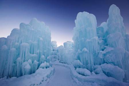 Crafted by hand using only icicles and water, ice castles feature tunnels, fountains or waterfall, slides and archways. Past castles have also had throne rooms. LEDs embedded in the ice light up the castle at night.