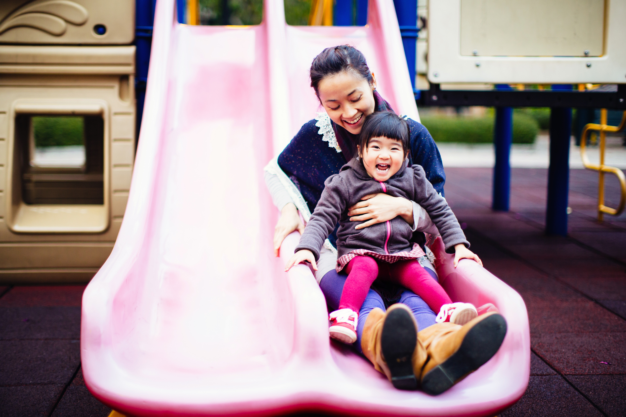 And instead of sitting with the child on the slide, another idea may be to stand beside the slide, using your hands to guide the child down until they reach the bottom.