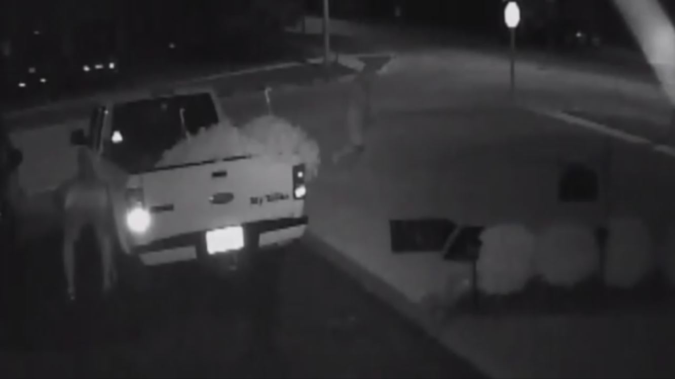 “You could watch two gentlemen walk across, they came over and they put the four nails in the tires,” Jim Jackson told Global News, adding the wood stain was later poured on his truck.