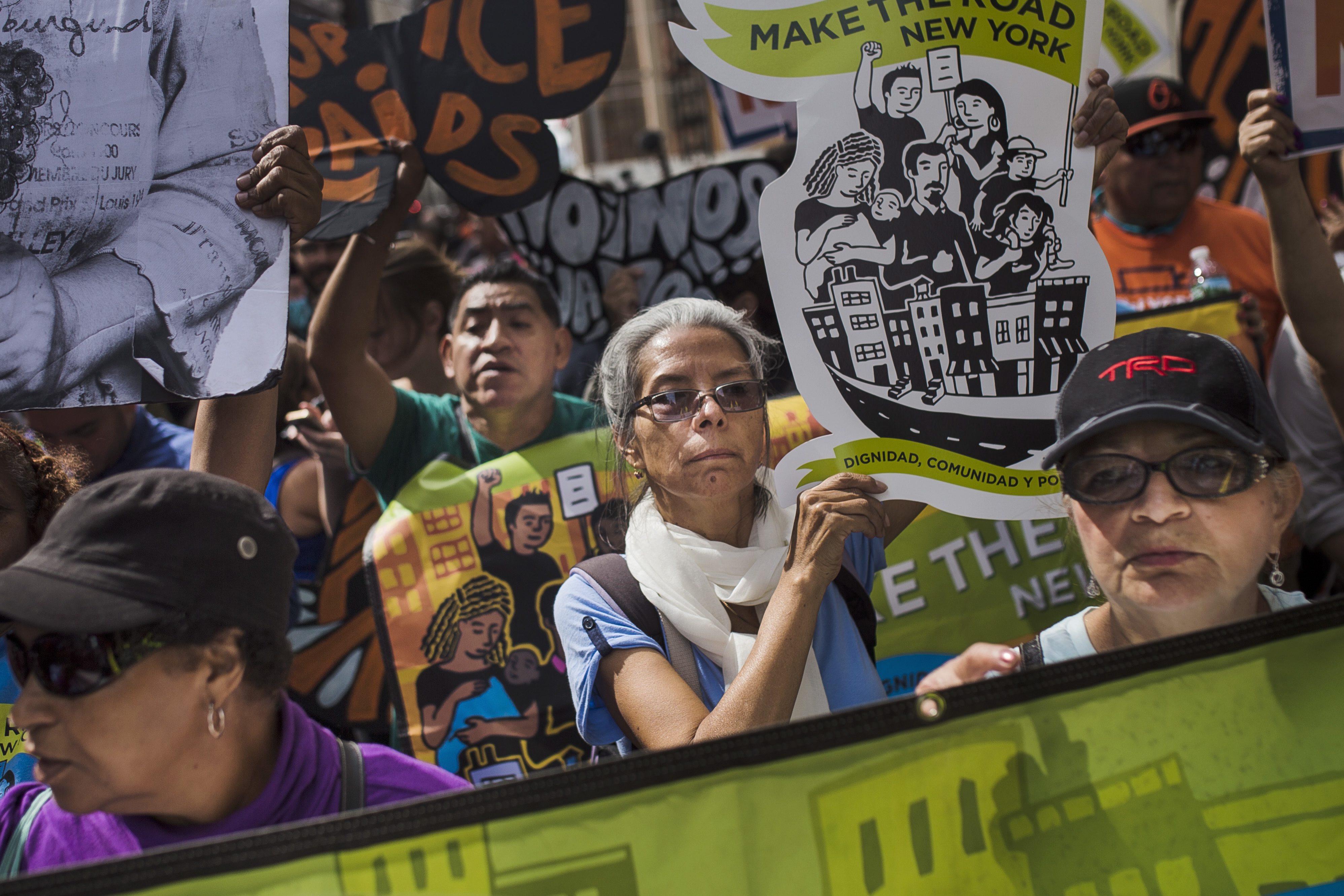 U.S. Reps. Raul Grijalva, of Arizona; Luis Gutierrez, of Illinois; and Adriano Espaillat, of New York, were among a small group of demonstrators who sat down in the street on New York’s Fifth Avenue on Tuesday and refused to move.