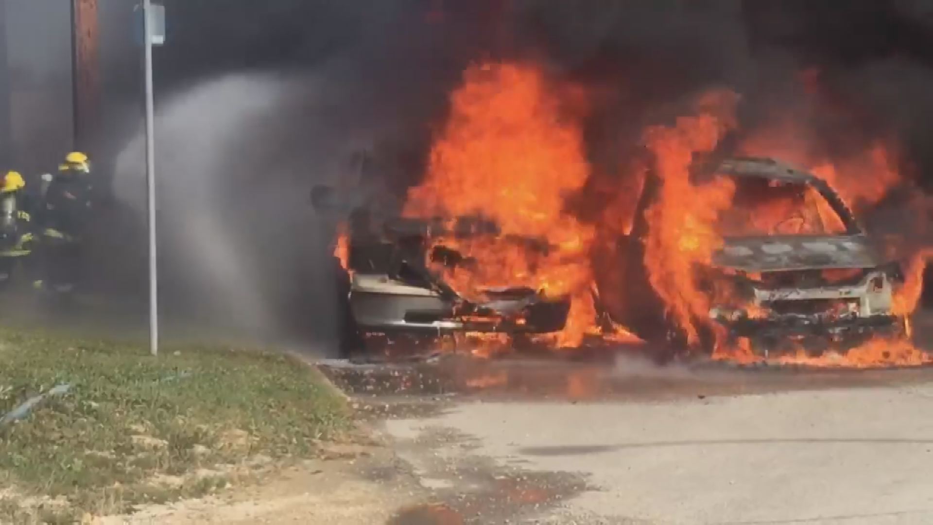 Fast moving flames were captured on camera as they engulfed two vehicles in St. James.