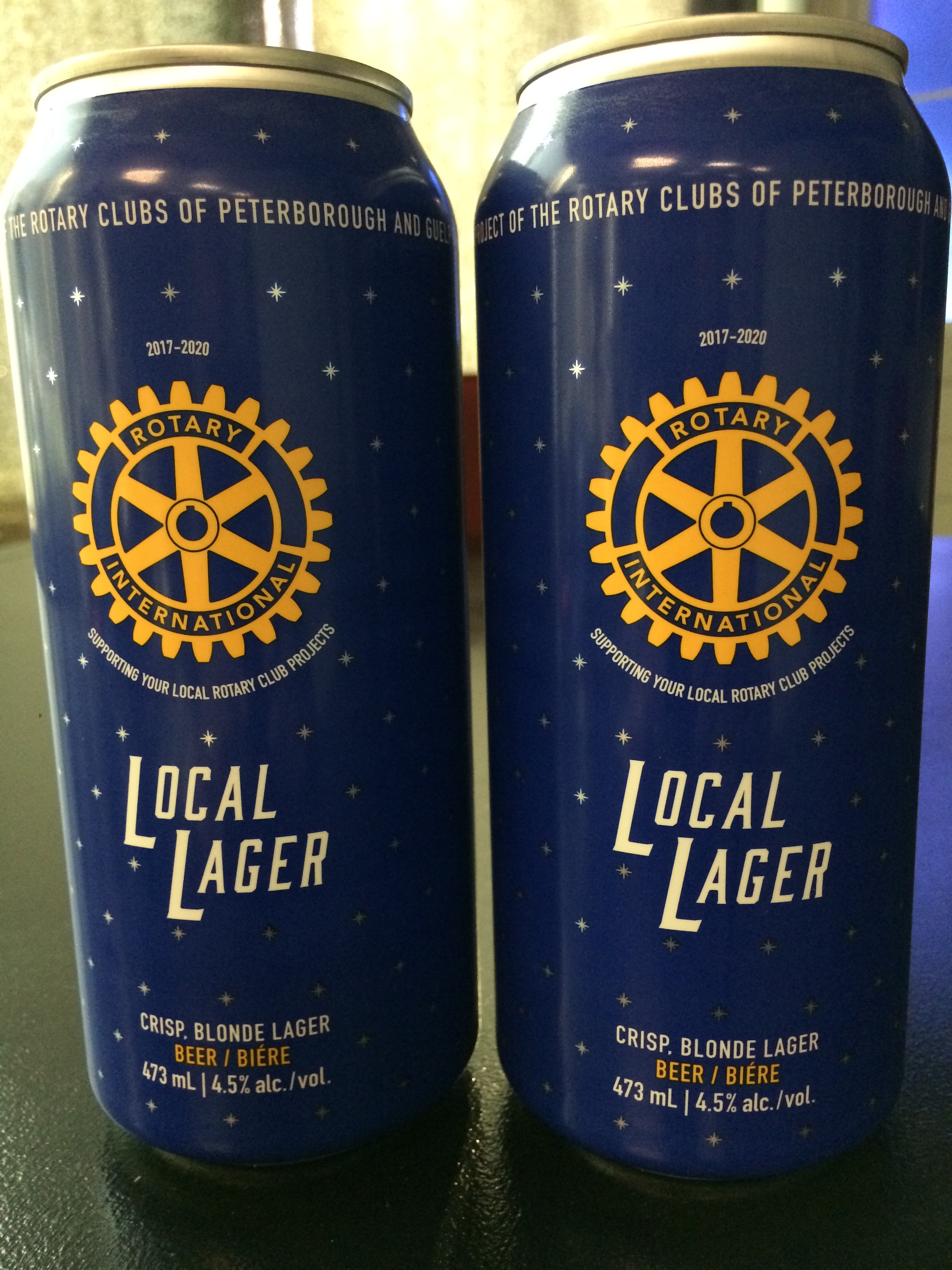 The cans feature the Rotary International logo with the organization’s principles list on the back.