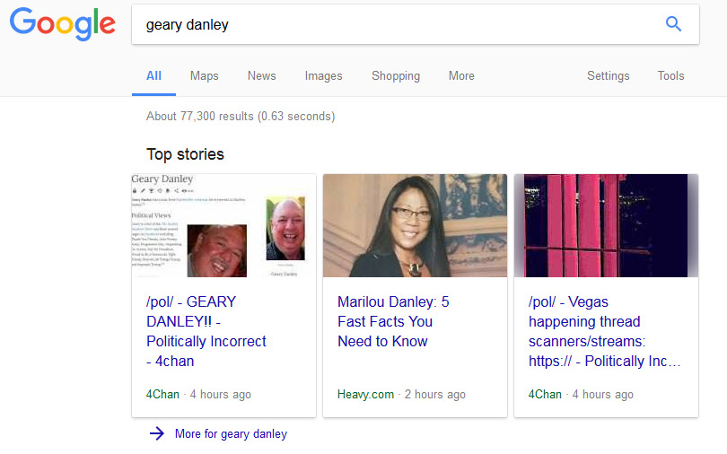Is Danley guilty of the worst mass murder in U.S. history? Or is he falsely accused? For much of Monday, Google offered a jumble of possible facts; take your pick. In the top stories slot at the top of the page, where they get a bit of implied legitimacy, are threads in 4chan, a discussion board which has been a toxic centre of alt-right troll culture.