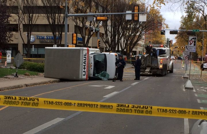 The U-Haul ended up on its side on 100 Avenue, near 107 Street, near The Matrix hotel.
