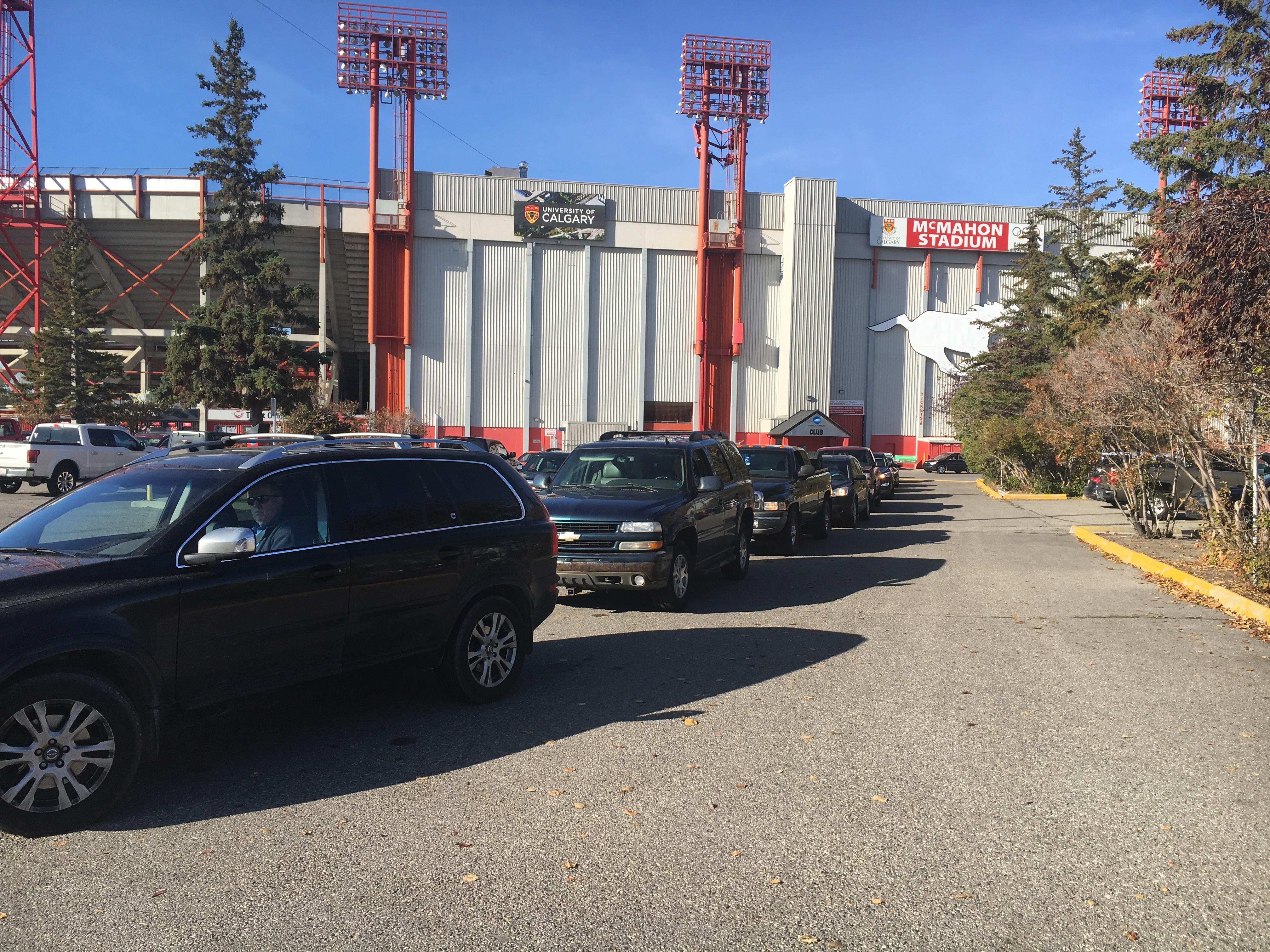 The line of vehicles waiting to vote in the City of Calgary’s new drive-thru polling station stretched all the way through the McMahon Stadium parking lot on Wednesday.