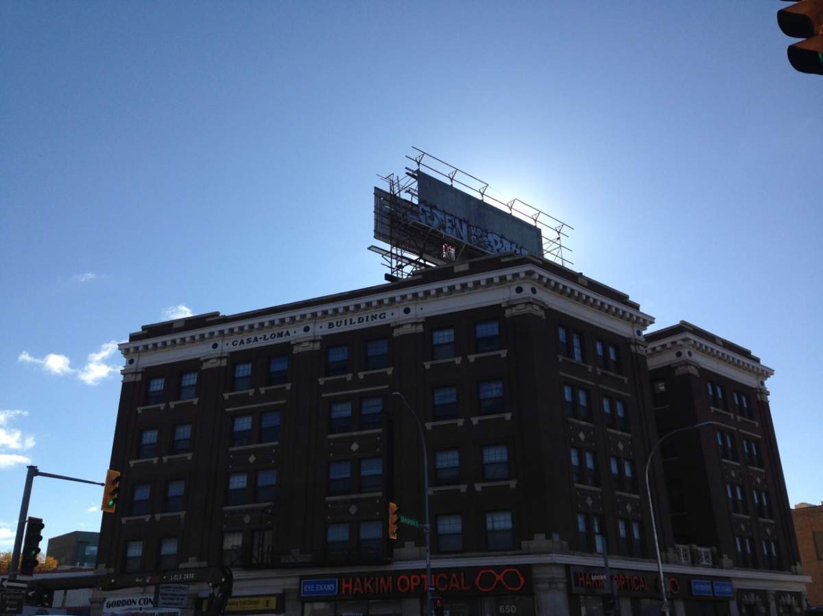 That’s where you’ll find the Casa Loma apartment building. Over the years its exterior has been renovated and beautified, but one unfortunate element of the building that remains: a giant metal structure that once displayed one of the biggest billboards in the city. The metal frame now displays nothing but graffiti.
