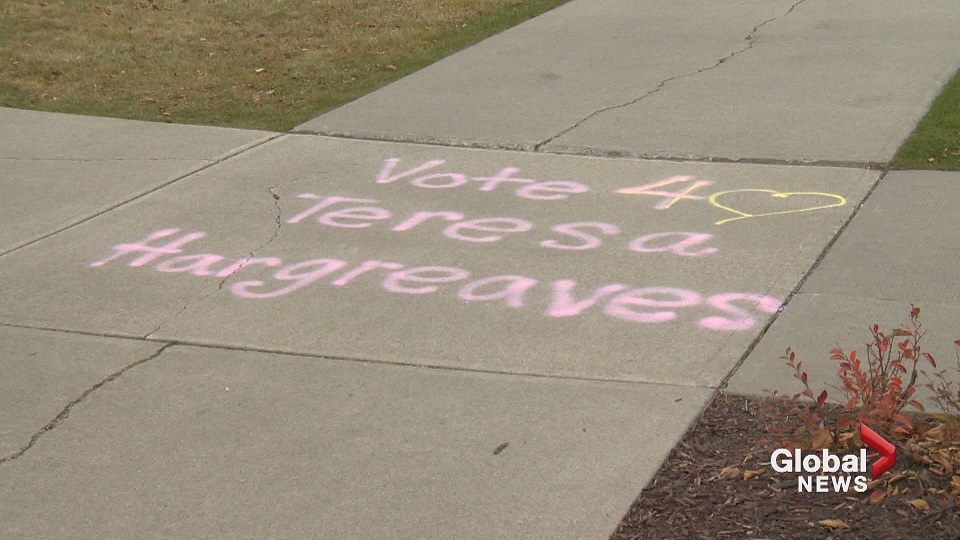 Residents in the community of McKenzie Towne woke up to an election slogan saying “Vote 4 Teresa Hargreaves” on public sidewalks in the area this weekend.