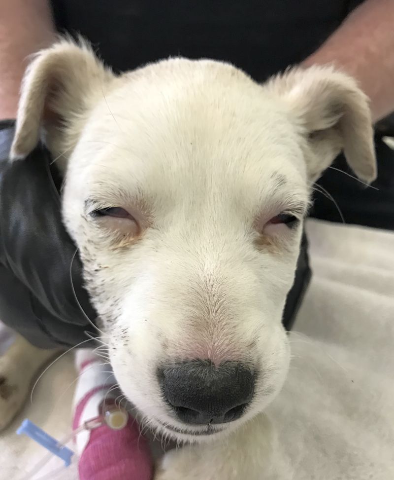 The puppy is described as a white, mixed-breed — possibly a Labrador/Australian Cattle dog cross — with faint grey spots, and about eight to 10 weeks old.