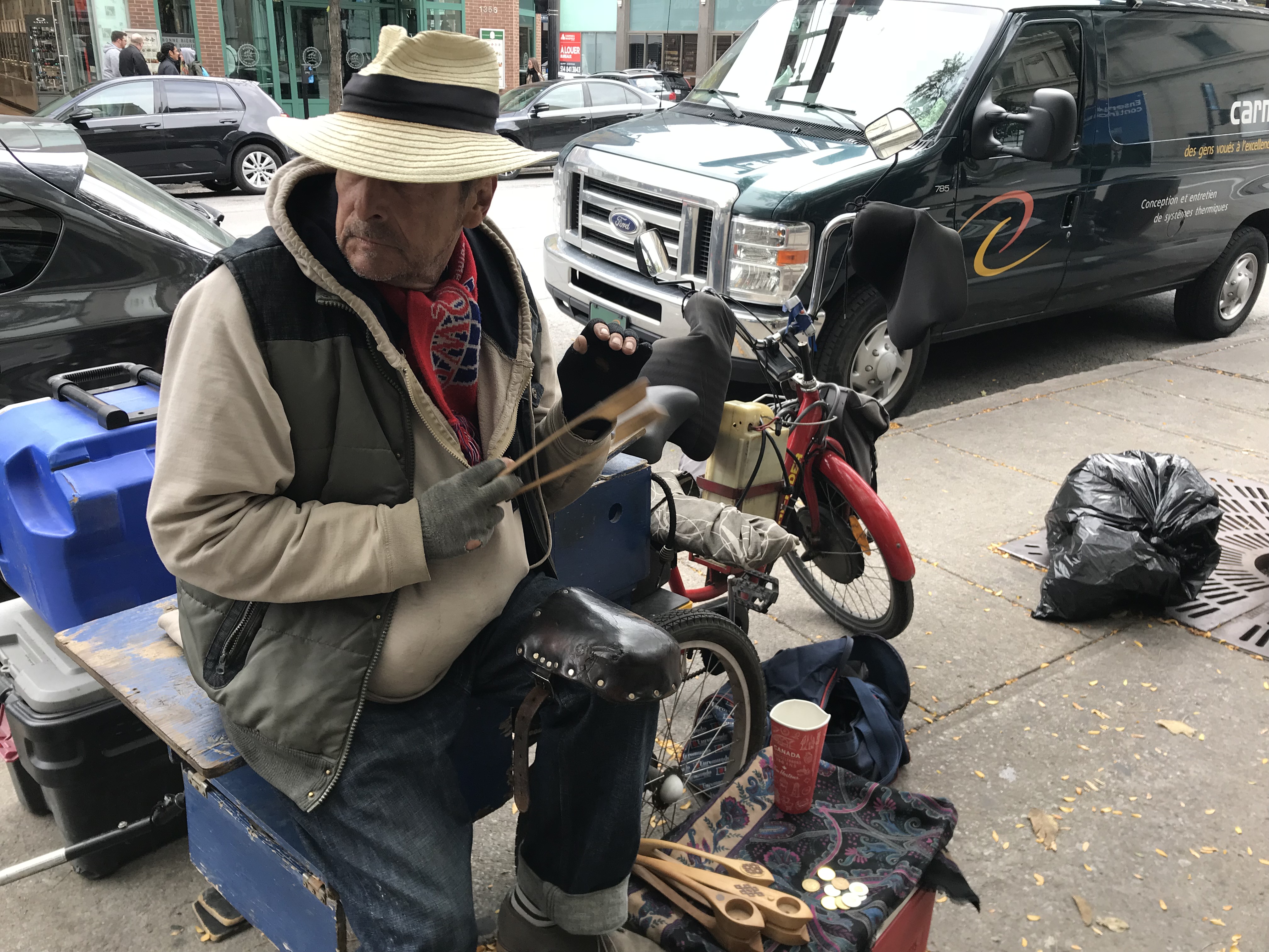 On any given day, Estève can be seen parked on a stool on his corner of Ste-Catherine street, clacking his wooden spoons along to the accordion and fiddle music that pours out from a small sound system behind him.