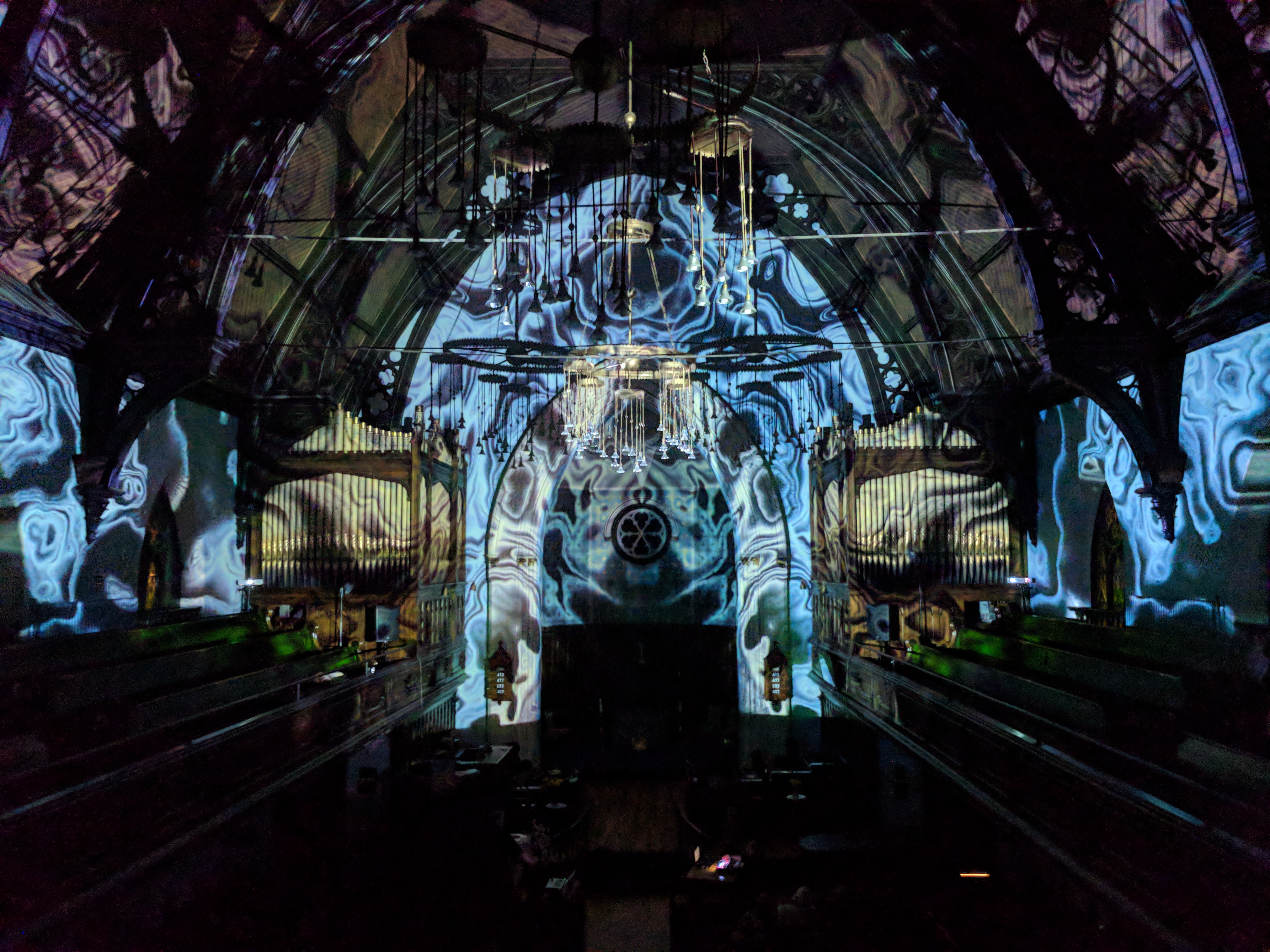 The walls and ceiling of a Halifax church were illuminated with flowing, curvilinear patterns manipulated by a keyboard operated by a German man Wednesday.
