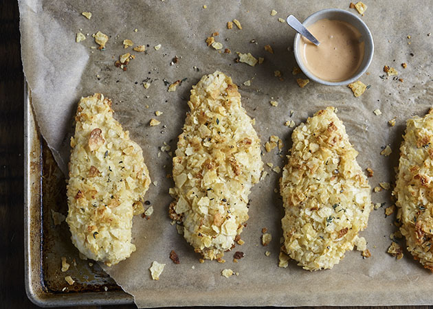 Bake in the oven for 18 – 20 minutes, depending on the size of your fillets, or until the chicken is cooked through and the chips have browned.