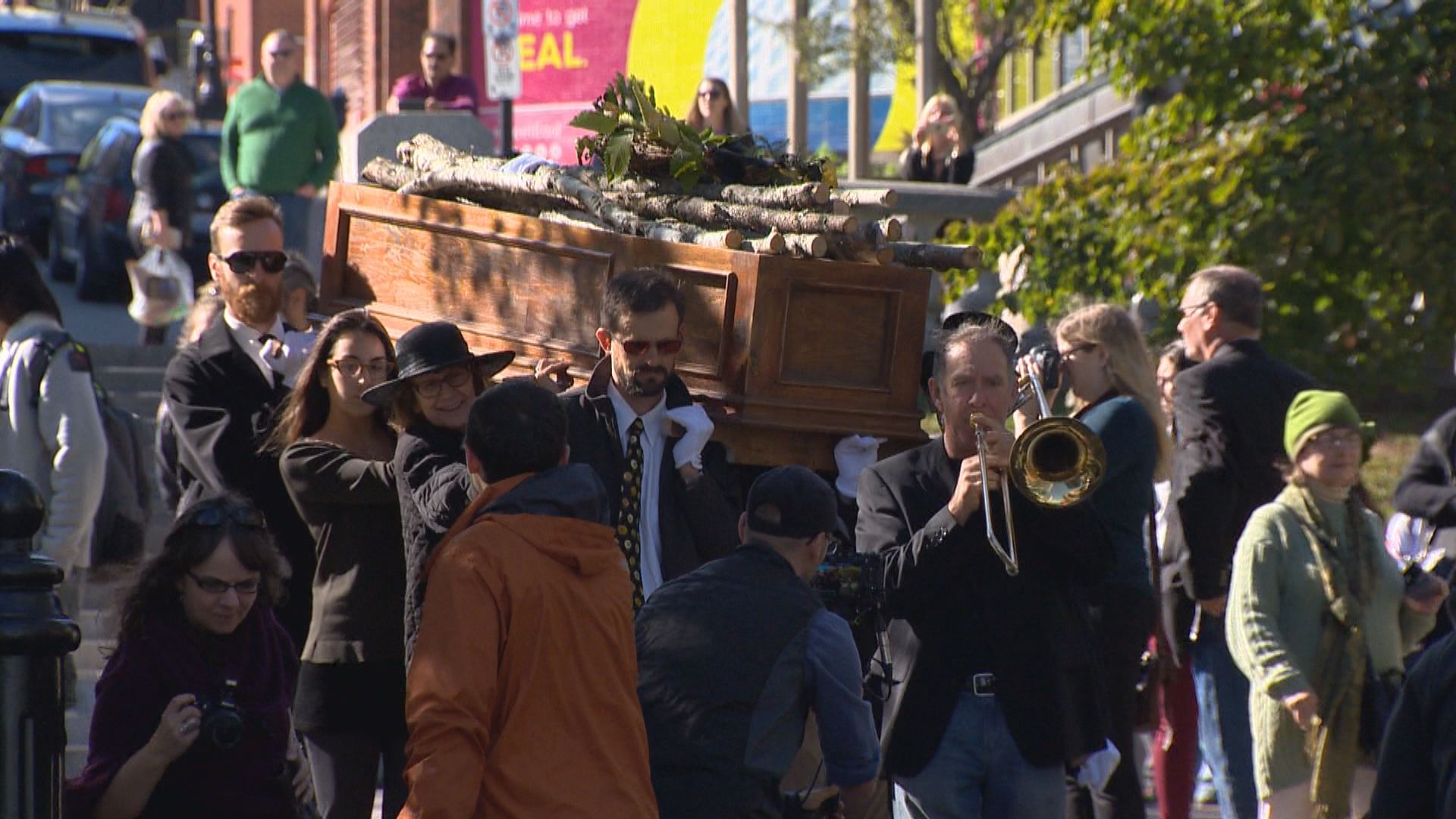 A marcher playing the trombone blasting Frédéric Chopin’s Piano Sonata No. 2 (a.k.a. the Funeral March) led a procession of hundreds of people on downtown Halifax streets on Thursday as part of a protest called the Forest Funeral.