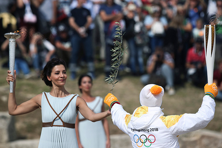 Tuesday’s first torchbearer will be Greek skier Apostolos Aggelis. He will then pass the torch to former Manchester United soccer player Park Ji-sung, a South Korean. The flame will be carried around Greece before reaching South Korea on Nov. 1.