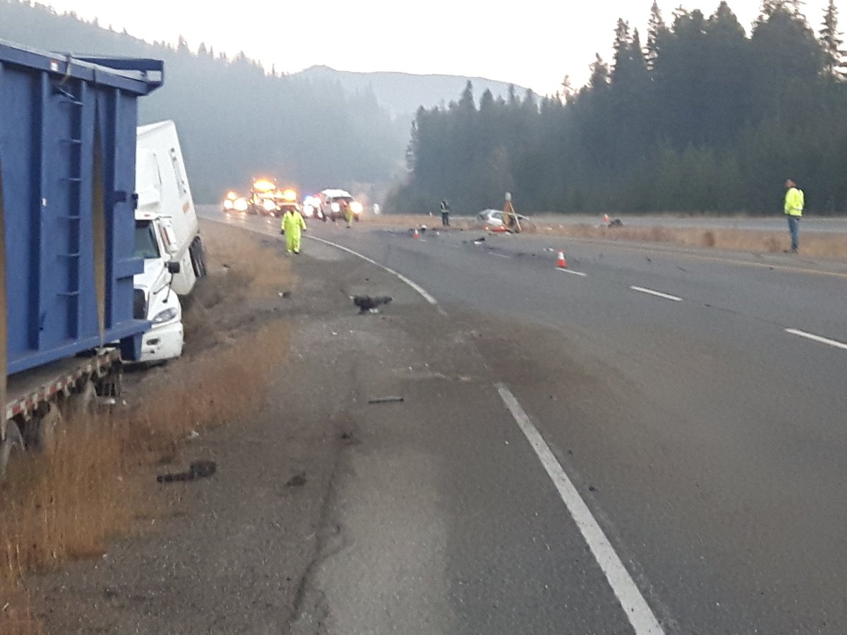 According to RCMP, a northbound Volvo was travelling in the southbound lanes south of Merritt near Juliette Creek around 1 a.m. when it collided with a tractor-trailer.